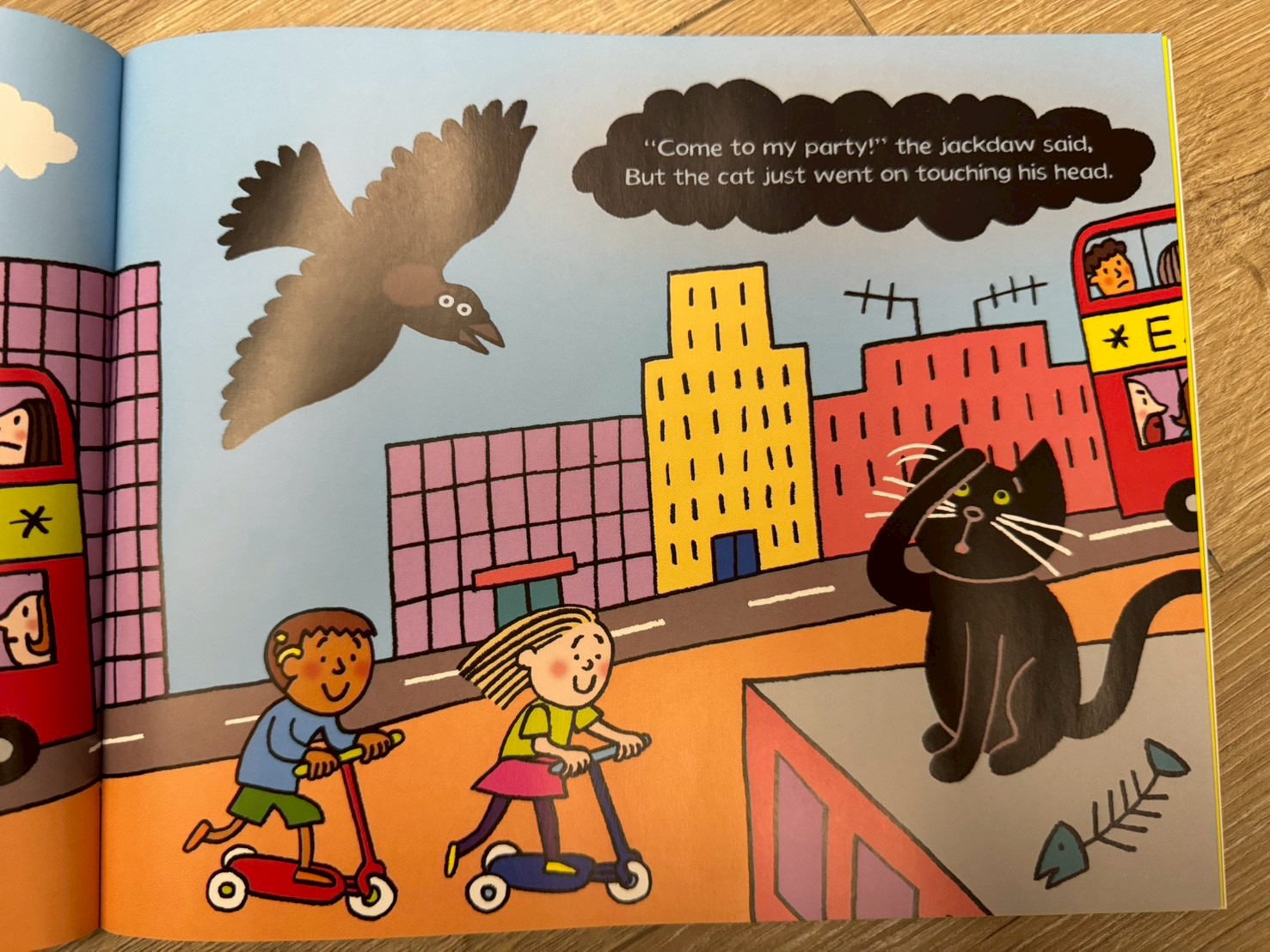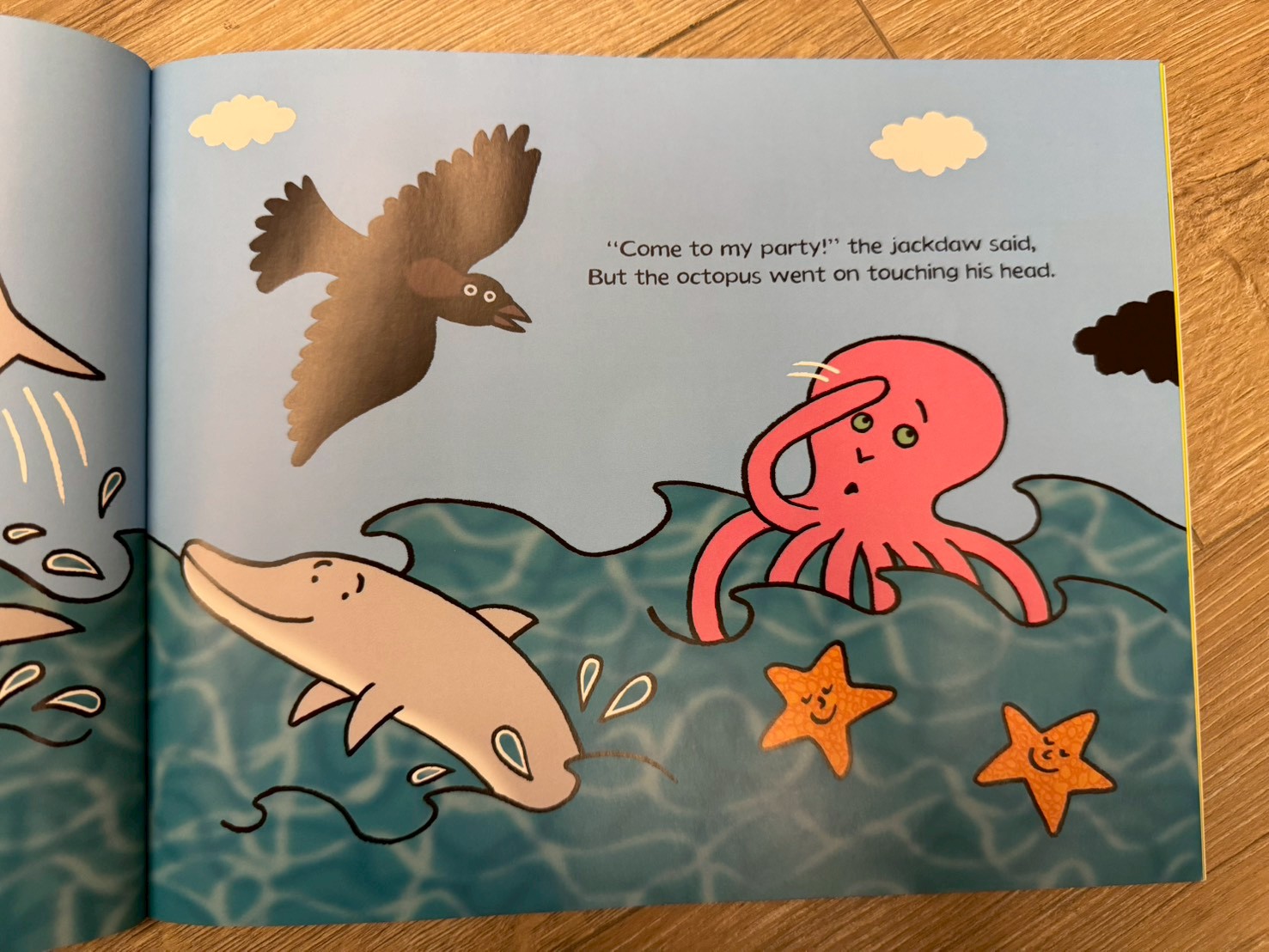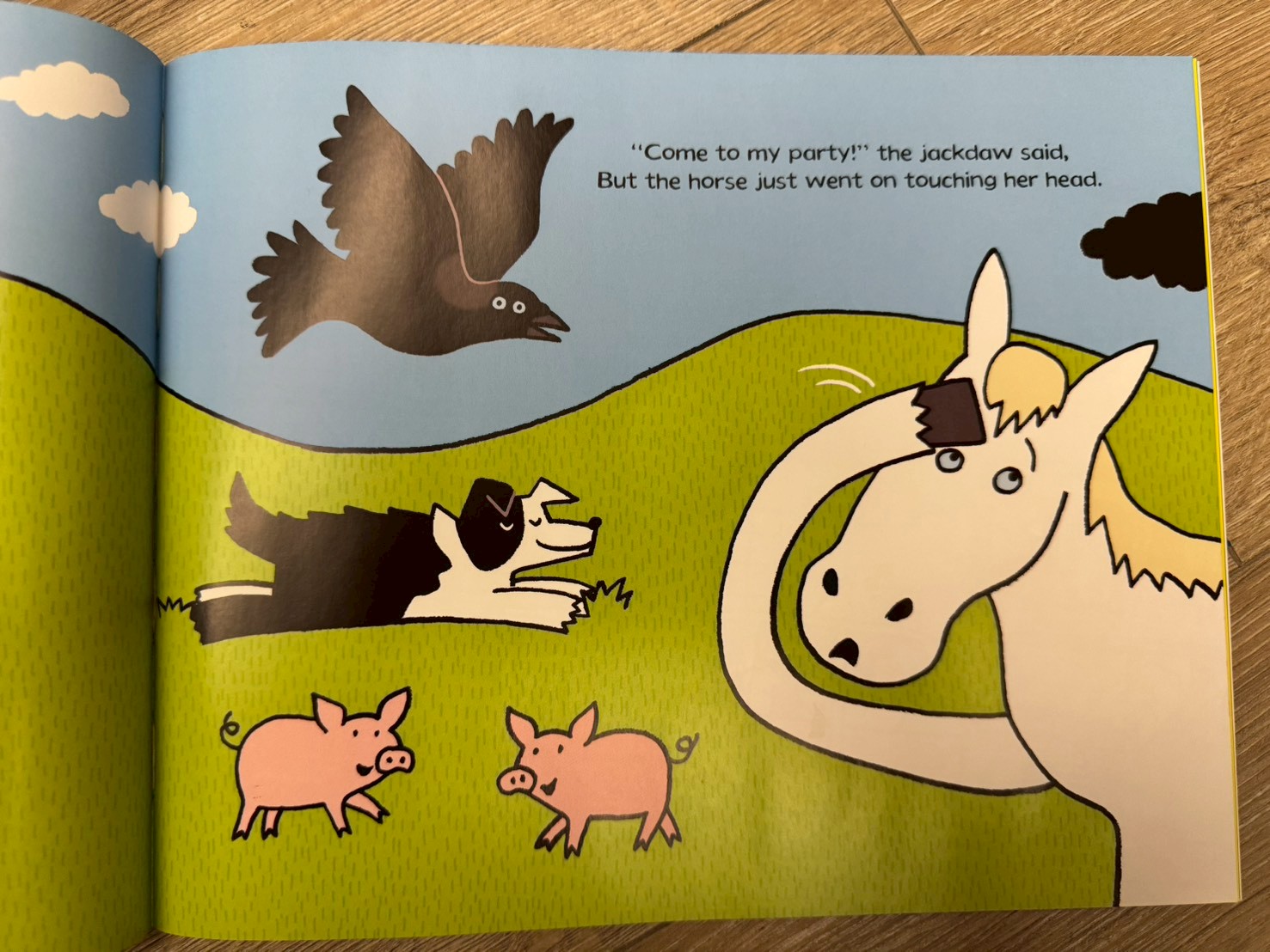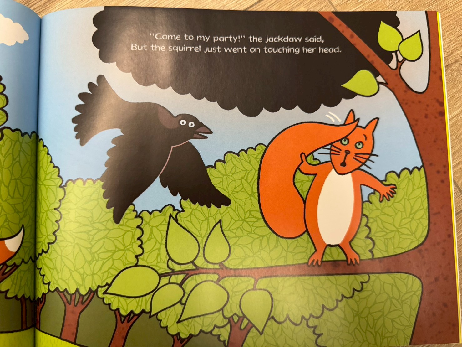 🔸故事中,寒鴉一路邀請章魚、馬兒、黑貓、松鼠來參加派對,卻沒一個回應他,反而都舉手扶額、似乎有話想說卻說不出來。