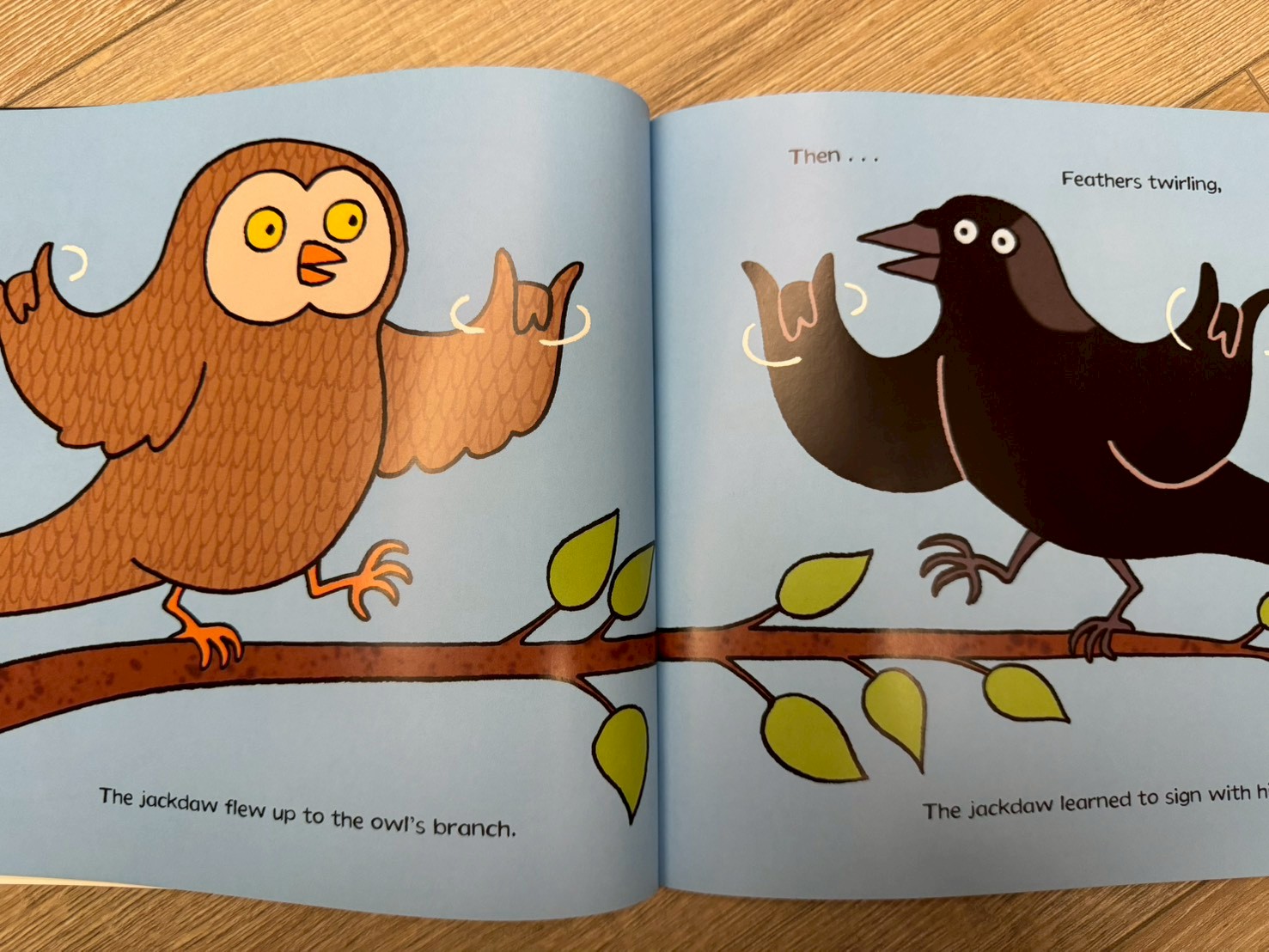 於是貓頭鷹教他:試著舉起雙手,用大拇指和小拇指畫圈圈(手語動作),再去試一次。
