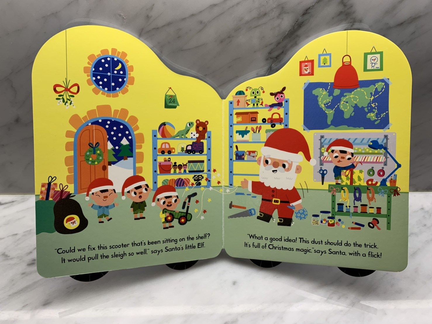 故事內容是聖誕老公公要去發送禮物,結果麋鹿們得了流感(好跟的上時事喔…),所以老公公改用滑板車拉雪橇送禮物,畫風很可愛,顏色很鮮豔是厚板硬頁書,我覺得嫩嬰和老嬰都會喜歡)