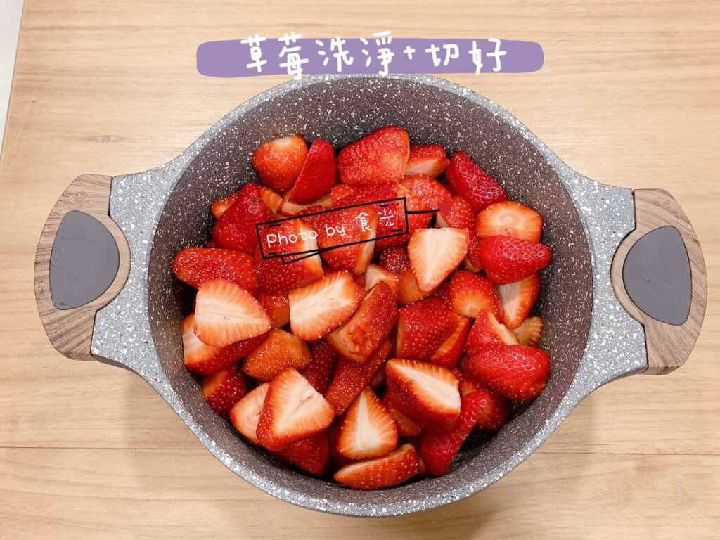 2. 去蒂頭,小顆草莓可以不用切,大顆的可稍微對切,放入鍋子裡