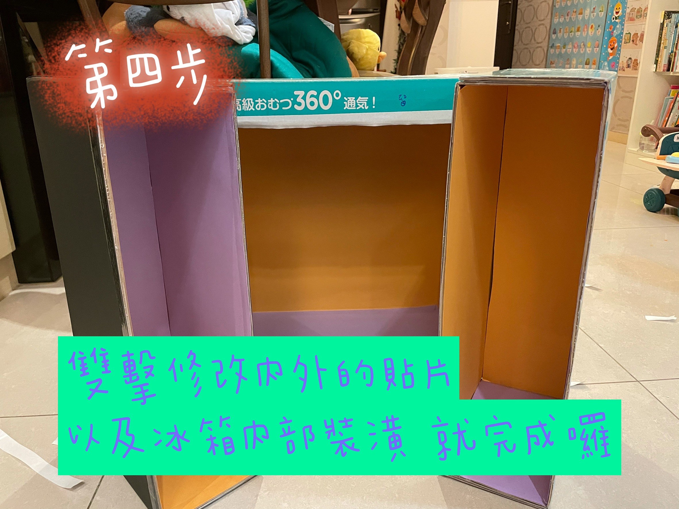 Tips: 切開1/4冰箱的時候,趁還沒兩個黏在一起錢,先將內部貼皮,省時省力