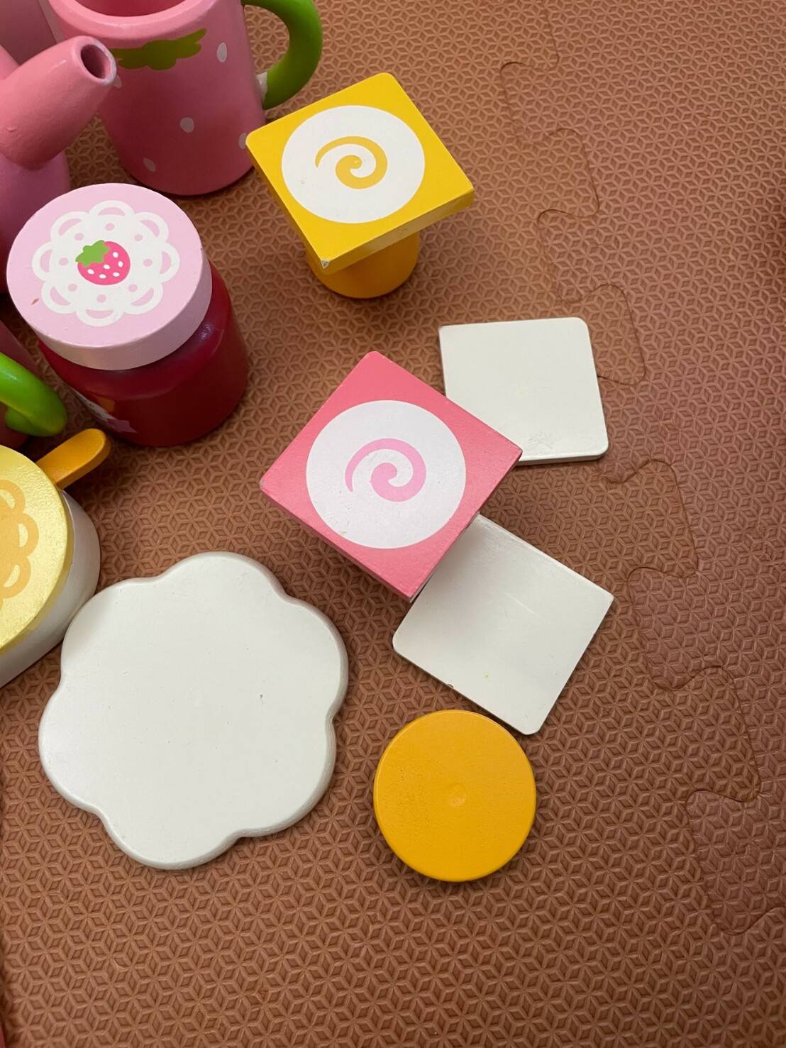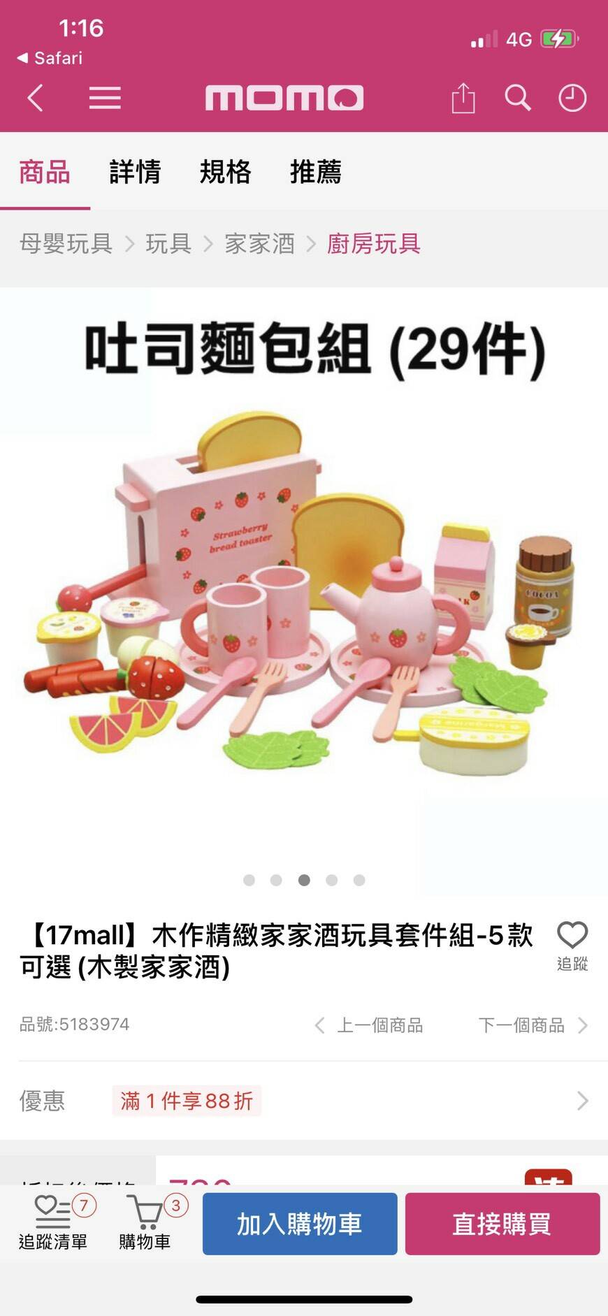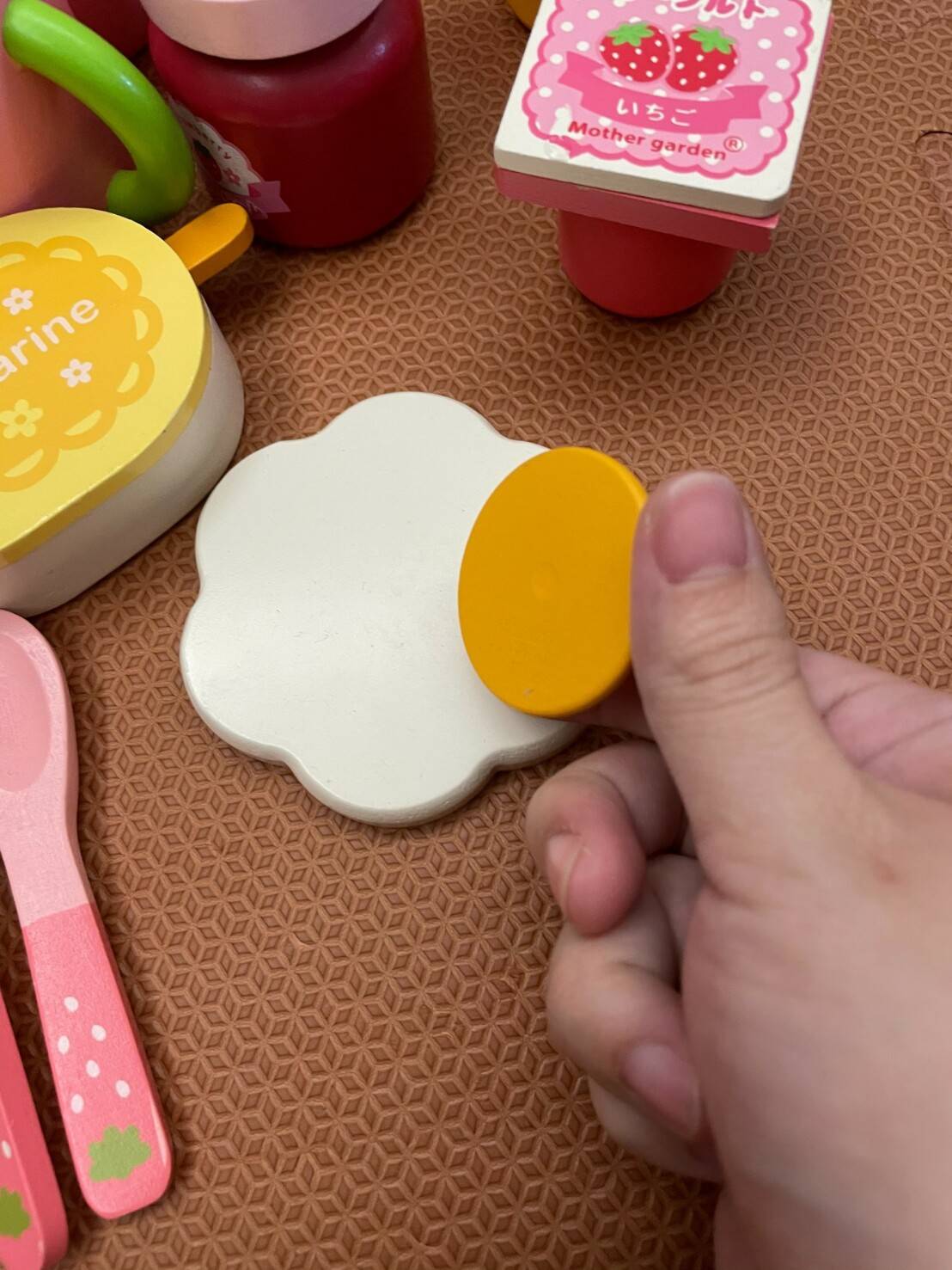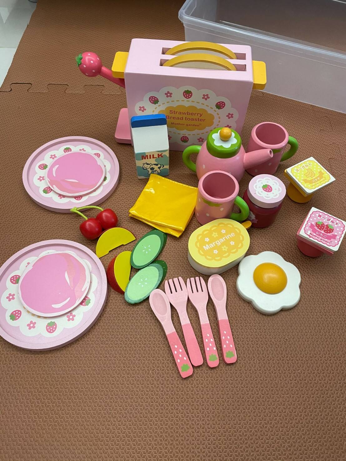lag很久來分享一下先前版媽推的家家酒套組, 這組是從親戚那接收過來的有幾件已經消失, 現在MOMO賣的好像也改版了, 舊版的是荷包蛋, 蛋黃蛋白可分開, 草莓&香蕉優格的蓋子可以打開, 磁鐵都是內嵌式的覺得安全, 新版的變成水煮蛋了, 女兒1y8m開始很愛家家酒遊戲, 動不動就是拿著杯子給我給爸爸喝, 不然就端著吐司食材走來走去, 可以自己玩一段時間, 讓媽媽可以休息一下 🤣