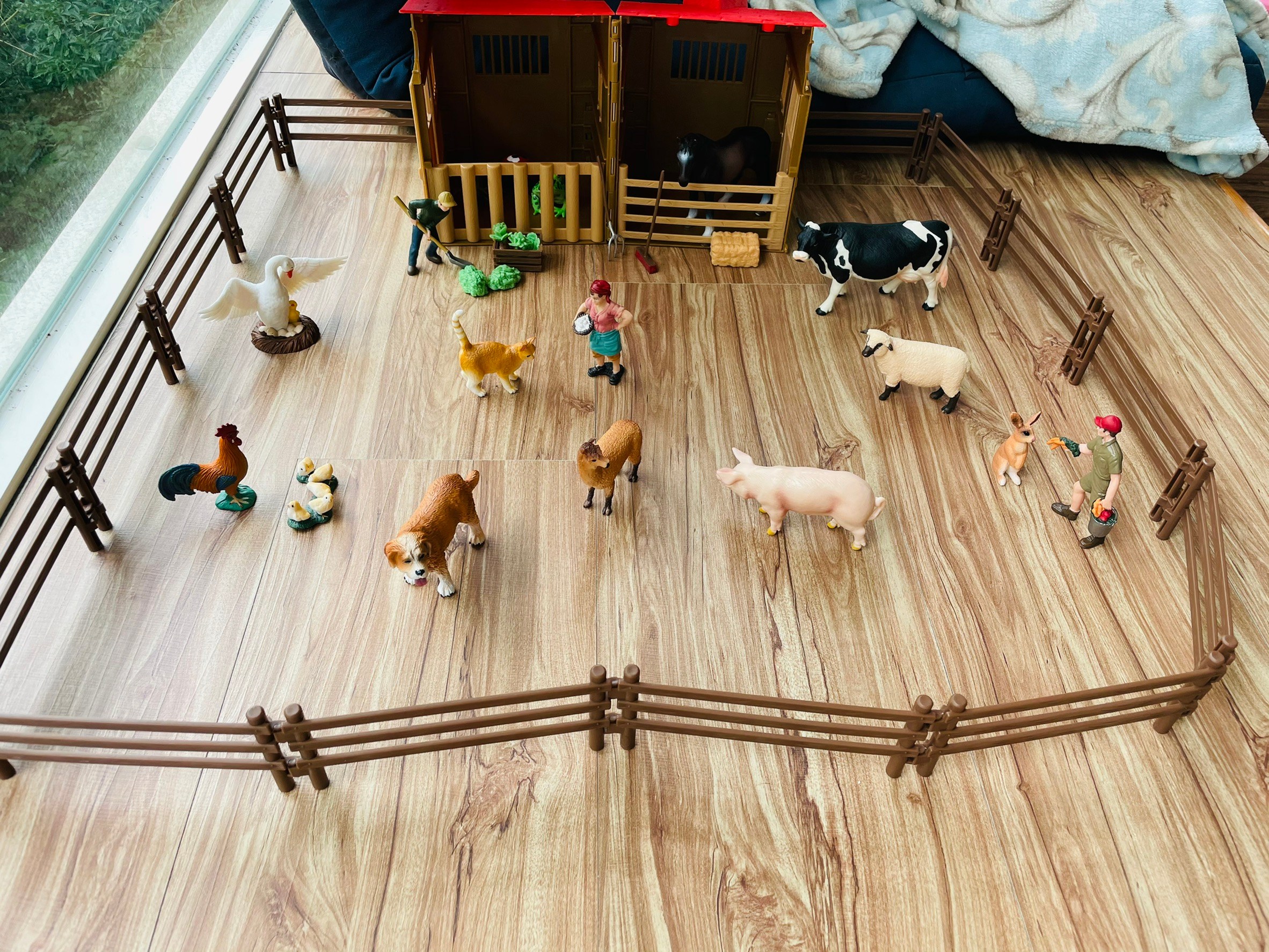這套農場組合是淘寶雙12的時候買的,但我沒特別比價,照片這一組臺幣5、600塊左右我覺得還可以~圍籬隨意可以組成自己喜歡的樣子,動物滿大隻的(但那個青蛙蚱蜢還有瓢蟲的比例很謎我不懂XD)、也沒有怪味,質感還不錯!只是農舍跟圍籬輕輕的,碰一下就會歪掉這點強迫症媽媽還在想辦法🤨