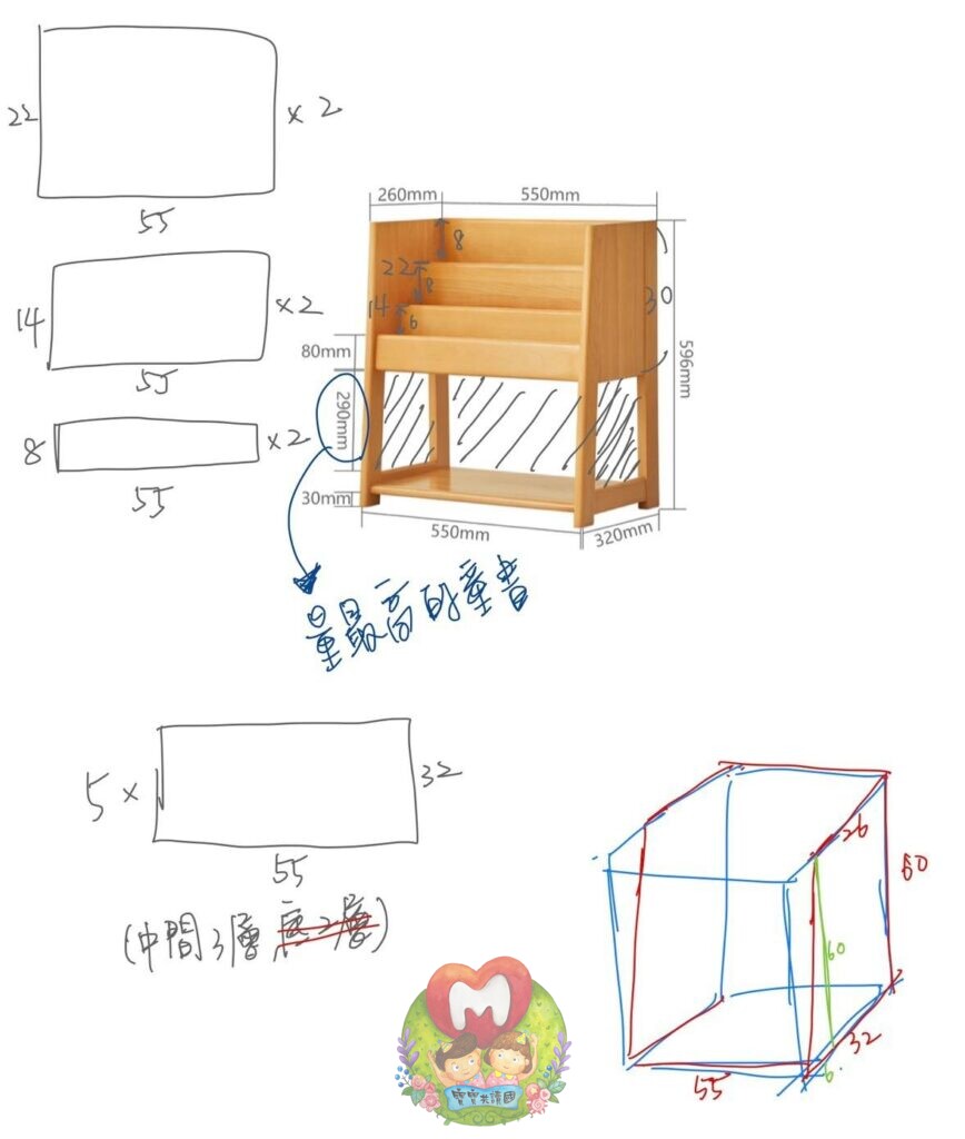 在規劃書架時我是先去搜尋展示書架的照片,從中選自己想要的外型,參考賣場的尺寸再配合紙箱大小來做