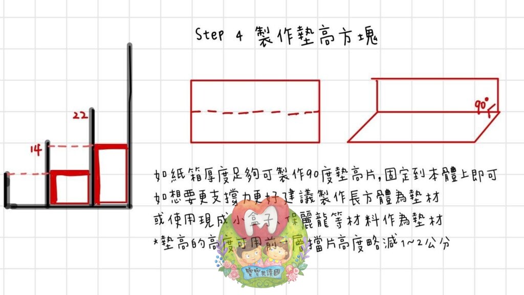 如果紙箱的後度足夠可自做如圖90度墊高片,固定到本體上即可(如要貼包裝紙建議先貼好再組合)