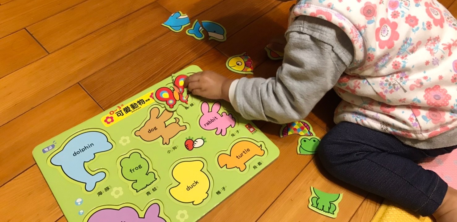 在綺綺1y6m左右開始拿出拼圖系列陪玩,一開始是我先拼給他看教她怎麼找相同物品放一起,然後媽媽先拼一片,另一片請她擺上去,現在綺綺會自己找出同樣圖案的拼圖分類,但手部精細動作沒那麼靈巧,凹凸需對齊的拼圖目前還無法自己拼好。