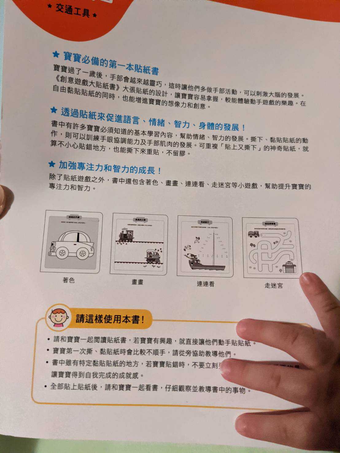 寶寶1Y2M後解鎖撕貼紙技能後,試水溫買了這本貼紙書,貼心的是它在第一頁有小提醒讓爸媽知道如何使用此書,例如“不要限制寶寶要貼哪裡,讓他先獲得成就感”,這超實用。