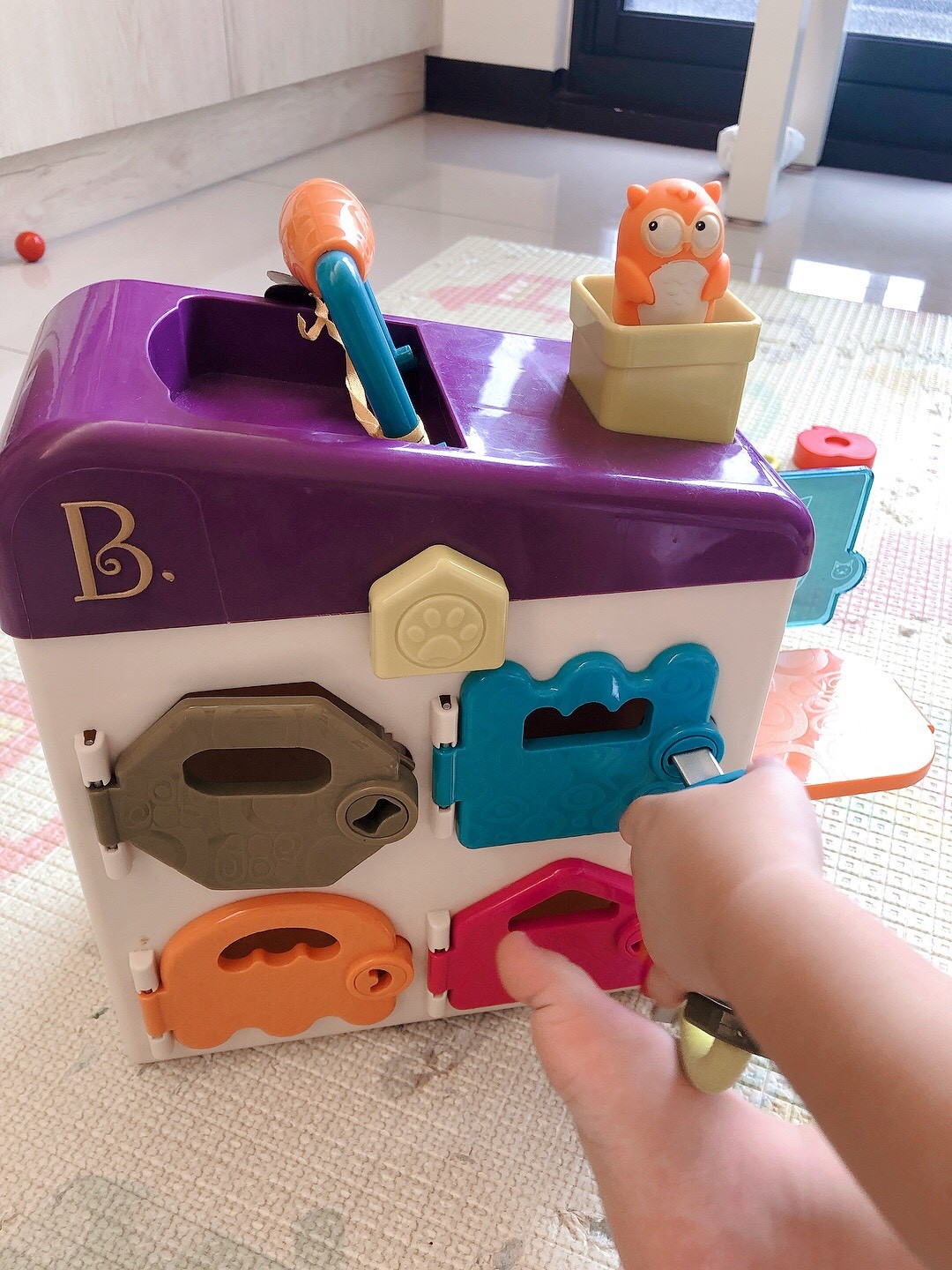 這款鑰匙配對遊戲,網路上有很多介紹,特色是有喜歡角色扮演能當醫生醫治貓、狗(玩具本身附的動物)。第二優點是空間辨識,也能記憶力訓練看看動物在哪間房間。