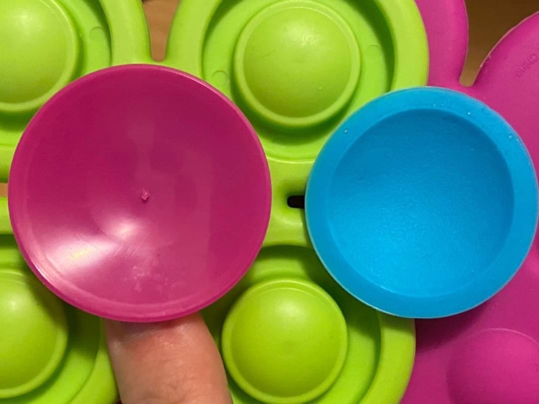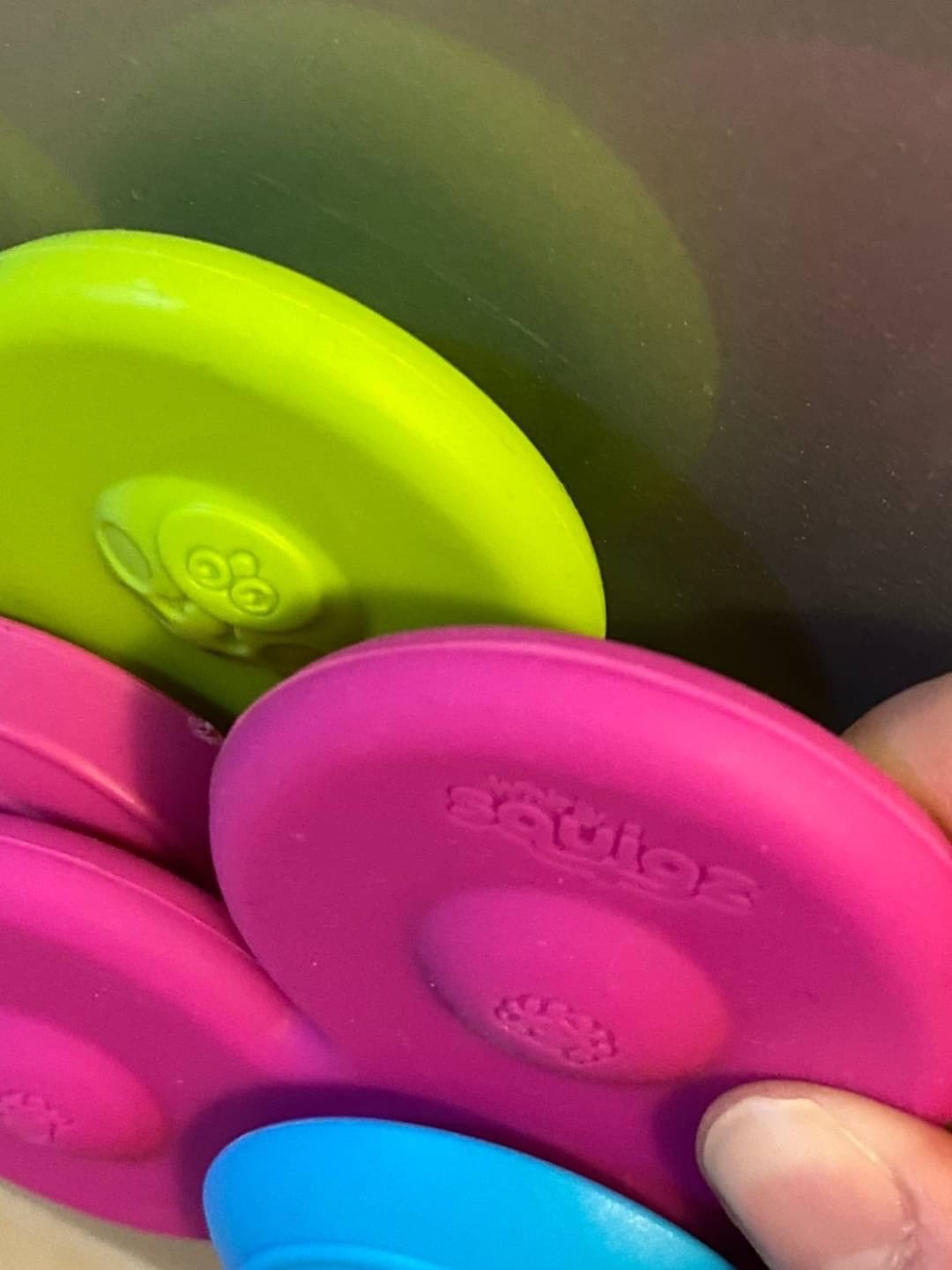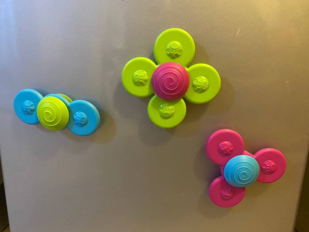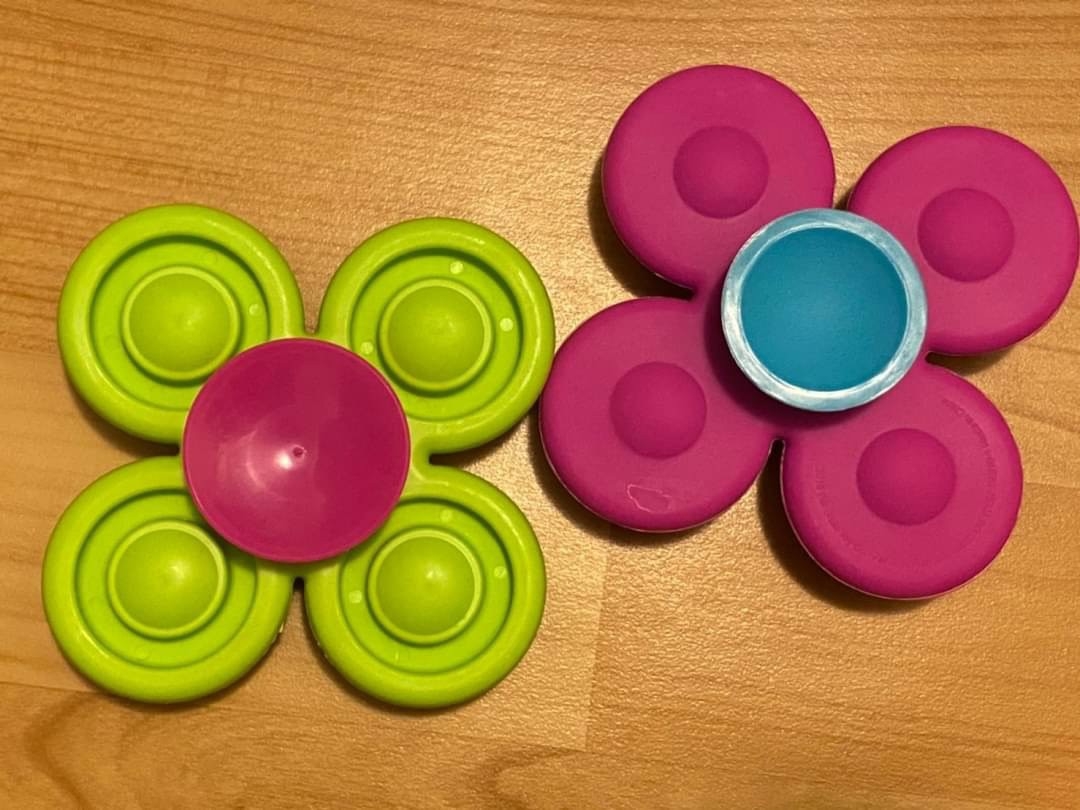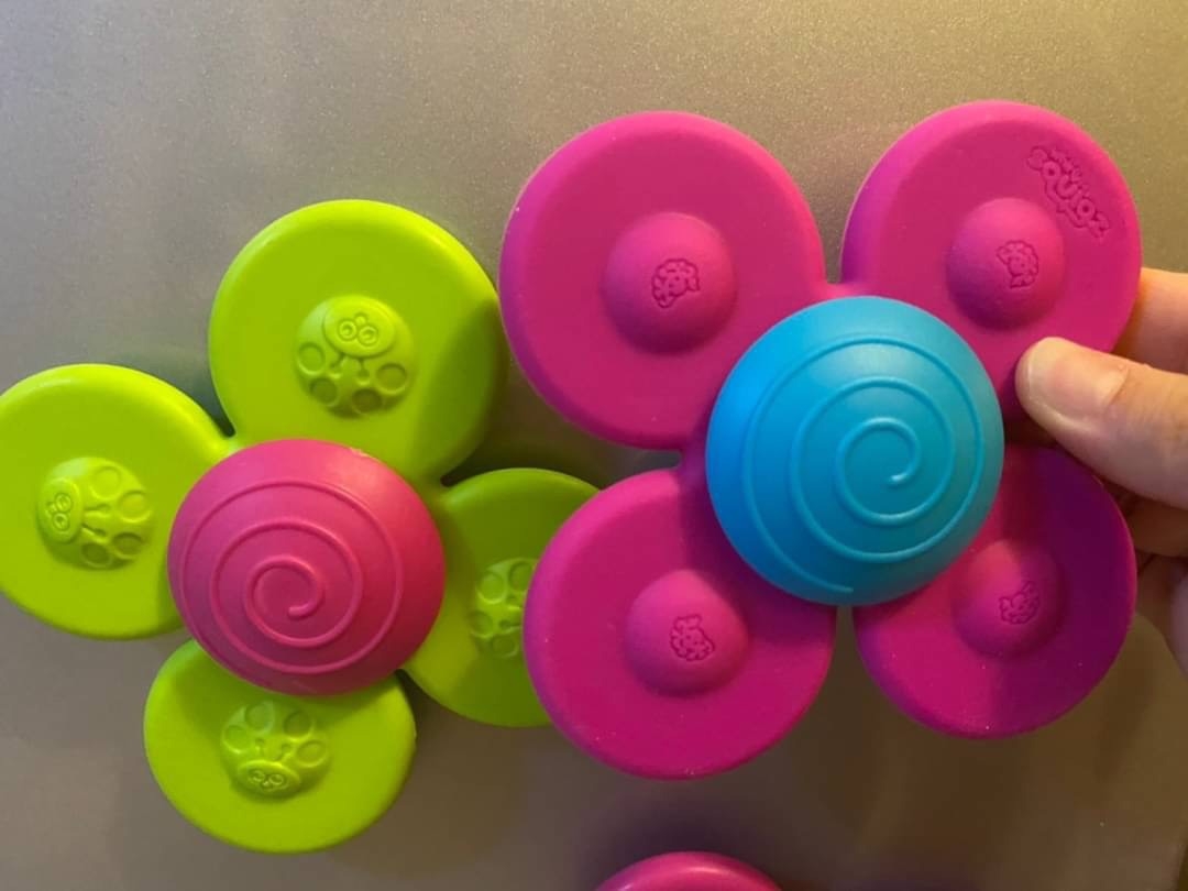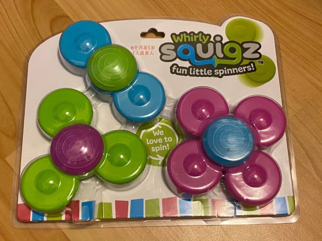 一開始是在某個團媽群組看到的,發現大家反饋小孩都蠻買單的,所以就一直有打算要買,後來看了團媽的圖發現有中簡,所以就在淘寶上開始找。這兩個我都是在淘寶買的,但有特別選擇fat brain的,會有koty的是因為淘寶賣家圖片放fat brain但實際寄來是koty。先說玩具本身其實點五(8m)算是很買單,會想要時不時去撥一下,但koty的轉盤材質是塑膠的,而點五還是很喜歡把東西往嘴巴塞,所以我在雙11的時候又在淘寶下手一次fat brain,這次有特別在評價確認買家秀內的圖片是Whirly squiqz 跟團媽圖相同,就很放心的下單了。這兩個主要的差異真的就是材質,轉盤跟吸盤的材質兩個可以看得出來有明顯的不同。實際摸起來,koty轉盤塑膠是硬的;fat brain是矽膠軟的。後面的吸盤,以同樣我家衣櫃來說,koty基本上黏不上會馬上掉,弄了點水也只能多撐個幾分鐘;fat brain大概可以撐個至少10分鐘以上。最後我將koty直接黏在冰箱上,到現在應該有超過半個月了,還沒有掉下來過。以點五來說,因為冰箱黏的很緊,所以她玩得很好,轉得很順利,但黏在衣櫃的時候,因為她會想要用力抓下來,所以基本上不太成功。以讓點五訓練手手的角度,其實兩個都可以,但以安心的角度,我還是會選擇fat brain。我蠻推薦的,因為讓點五隨意爬的時候,他會想往冰箱那邊撥個幾下陀螺在往別的地方,沒多久又會想去撥一下,而且都笑得很開心,覺得蠻值得的。koty跟fat brain我在淘寶上買大概是¥28 vs ¥118的差別。
