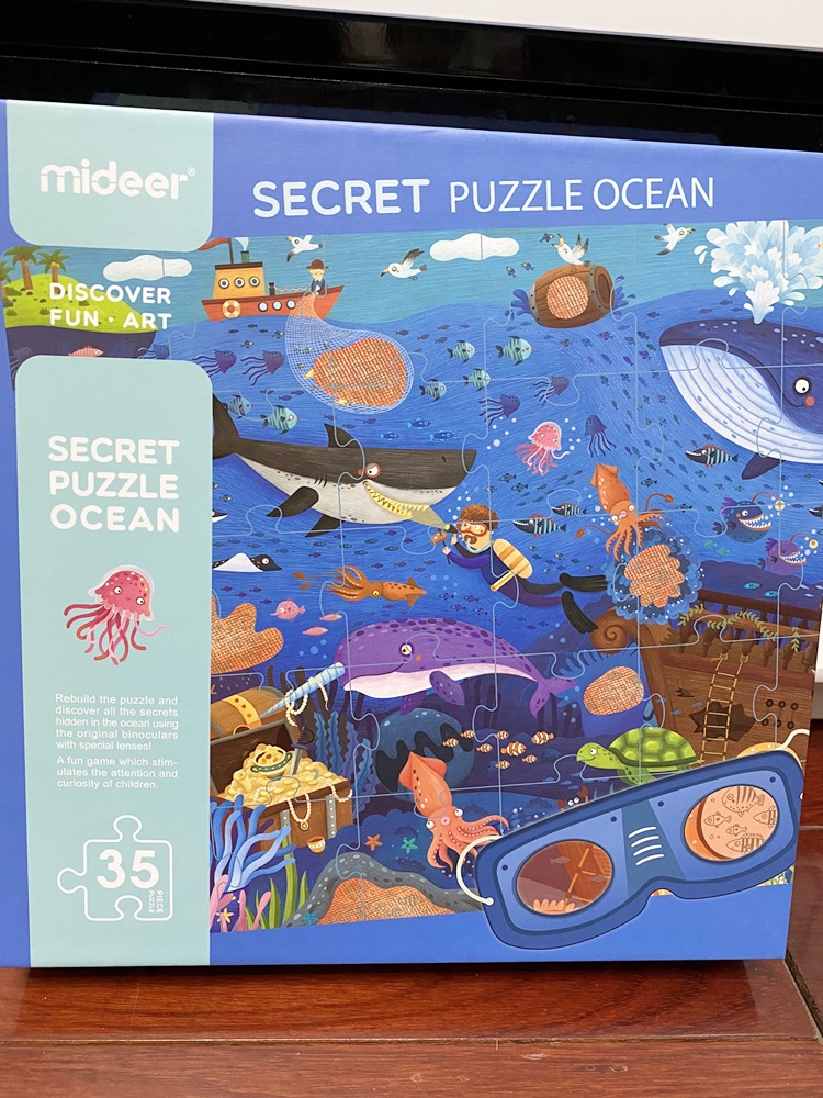 小孩子在拼圖的過程很容易遇到挫折,所以時常鼓勵女兒試試看,或者偷偷的幫助她讓她成功增加信心~最近入手的這組拼圖有35片,需要媽媽和小孩一起協力完成,一開始我會先拿小圖和女兒一起觀察,之後先拼出大概,然後再拿出兩片讓女兒去觀察哪片適合~有時在凌亂的拼圖中,她還可以找到鯊魚或者烏龜去組裝呢!等全部拼完後我們就拿出眼鏡去觀察海底世界的隱藏魚群~值得購入👍👍👍