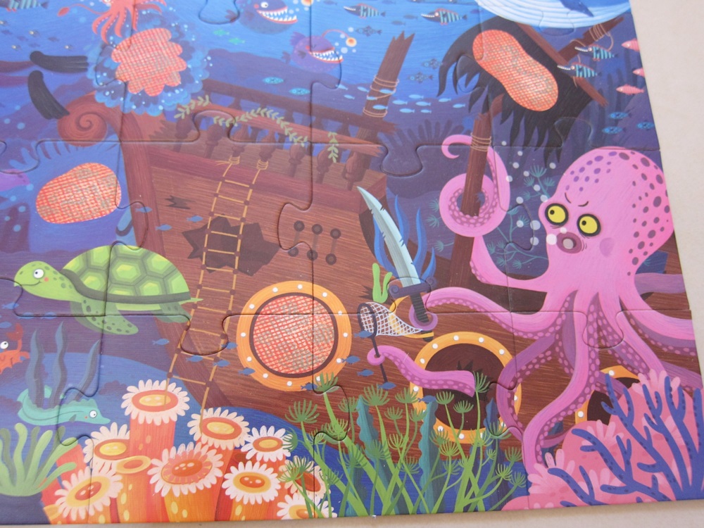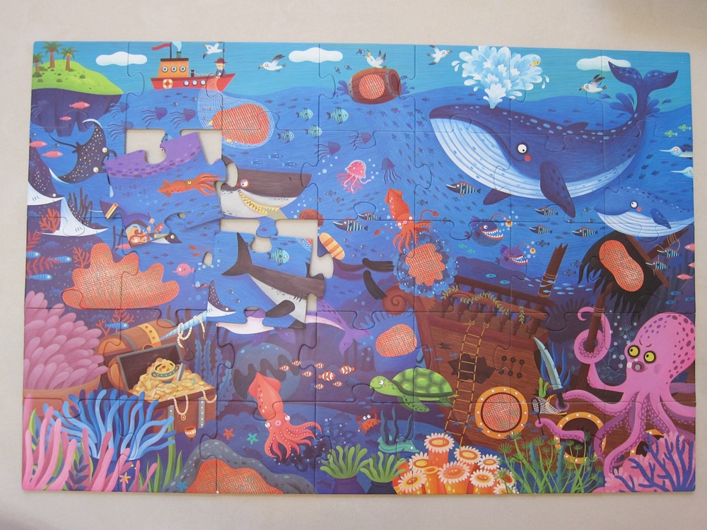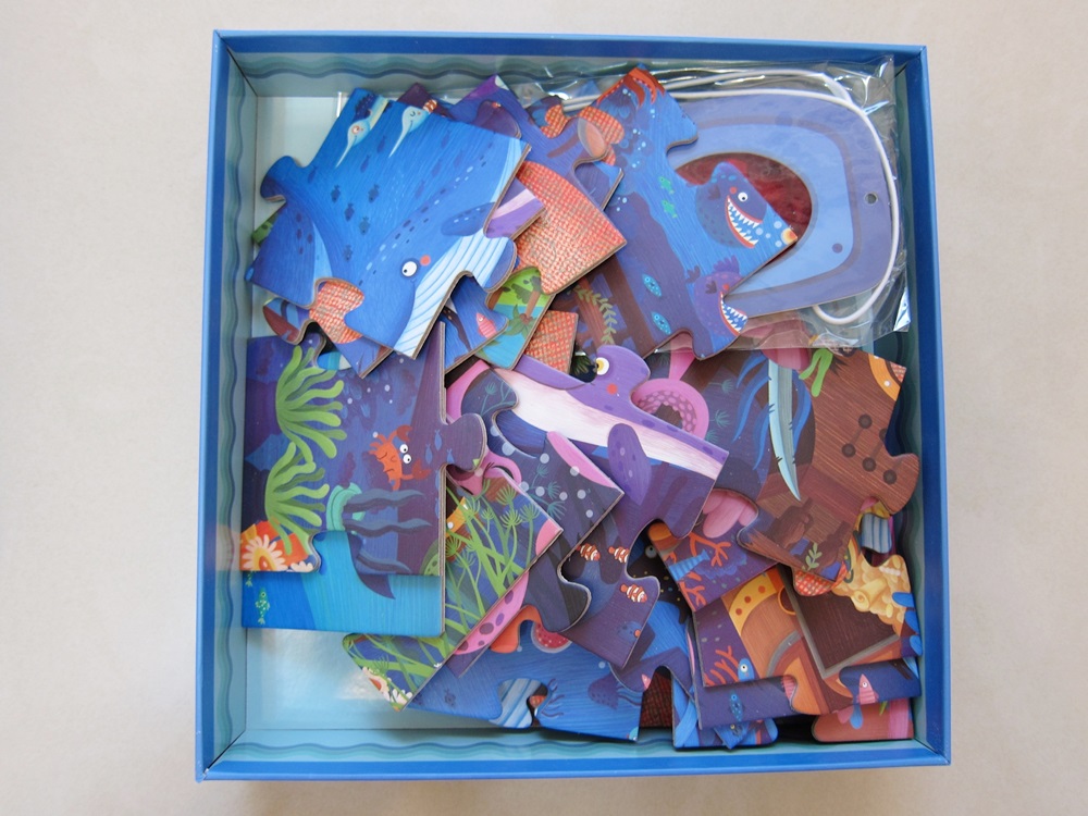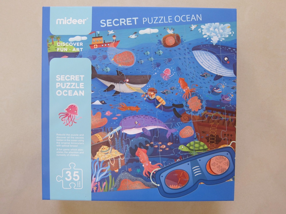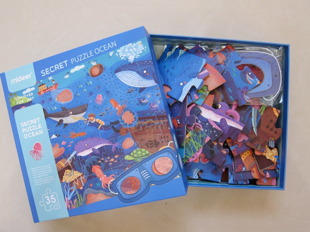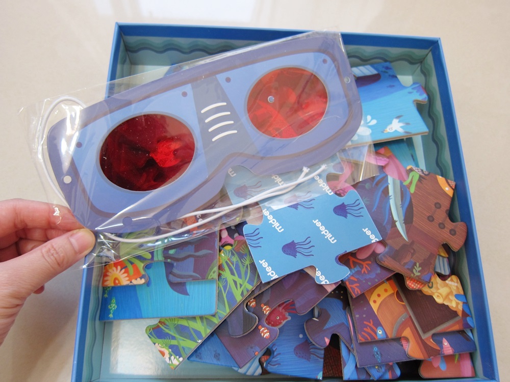 這組拼圖是mideer 其中一組。有海洋跟森林。我兩組都有買,目前開箱的是海洋系列。超級推薦啊!!!因拼圖很大塊,精緻度很夠。不過他拼起來是方形款,跟之前不規則的不太一樣,帶孩子玩的時候,可以從邊邊角角先找出來在拚起來會比較好上手唷!!!他附贈的眼鏡,可以找出隱藏的小魚兒。很好玩!!!