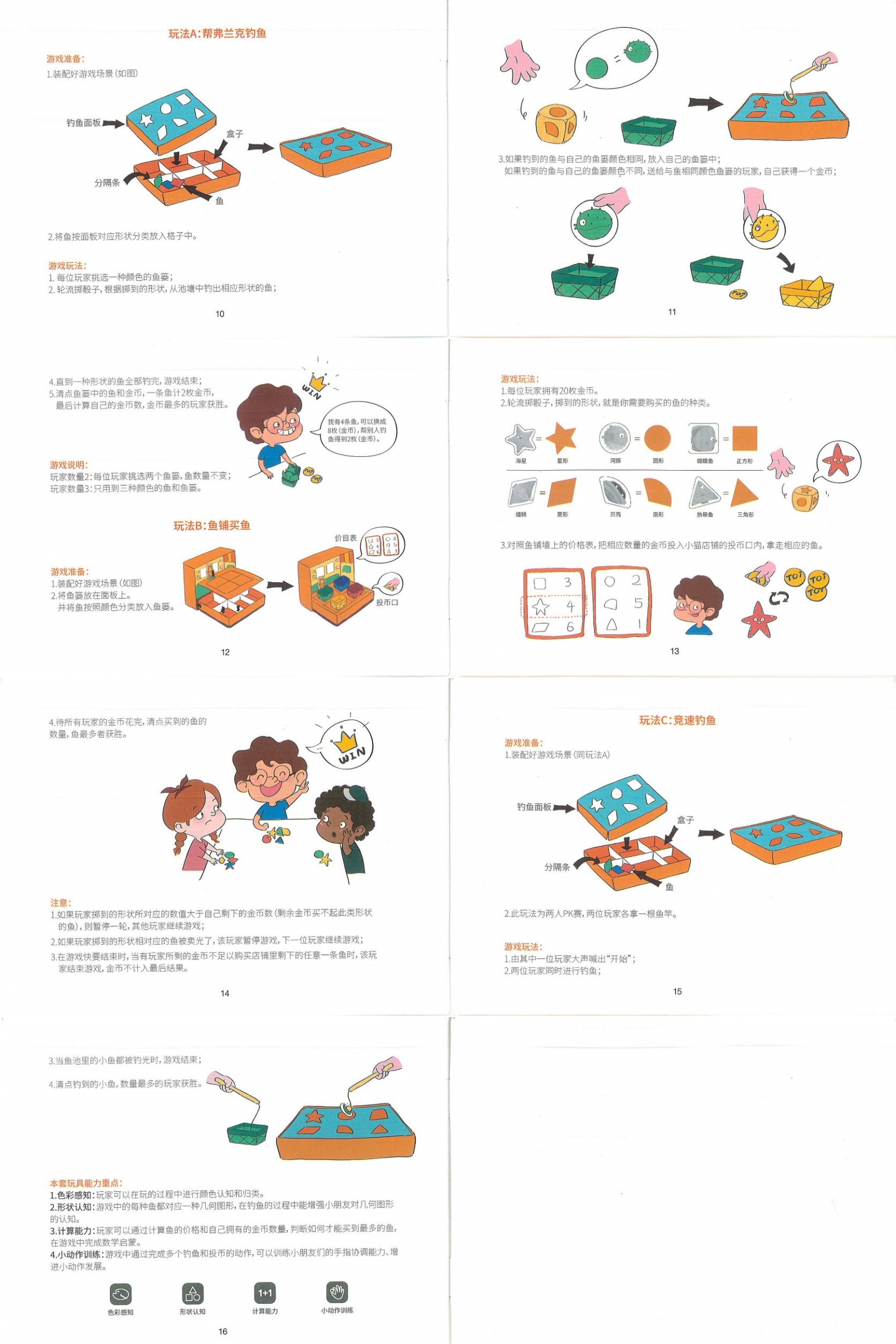 木製的魚有4種顏色、6種形狀,我沒依照說明書的玩法,只是單純引導女兒釣起來後,將相同顏色的放一起,或釣一樣形狀的圖案,但我女兒意見比較多,後來都是她指示我要釣哪一條跟放哪裡。