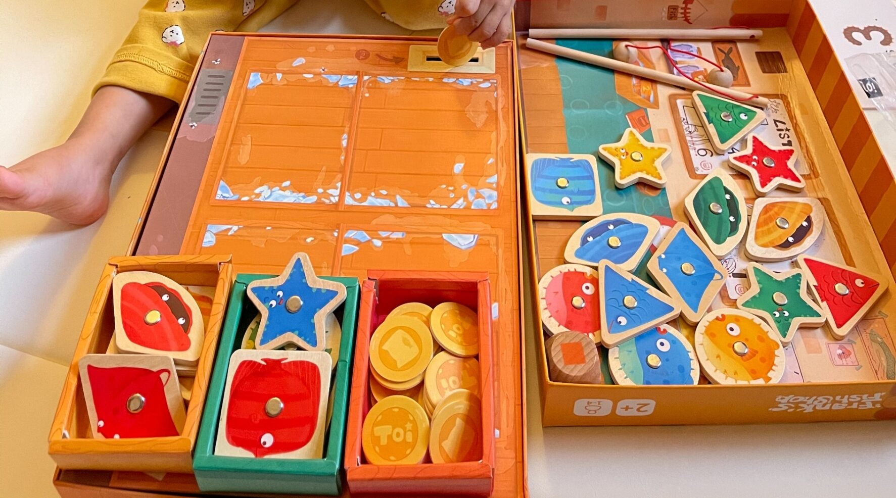 其實我是要買版媽曾經推薦過的喂小豬吃飯的那款桌遊,但送來的是這盒,本來有點失望,但我女兒對這款非常買單,一直釣魚跟投幣,開盒的那天睡前還一直要拿錢幣上床陪睡。